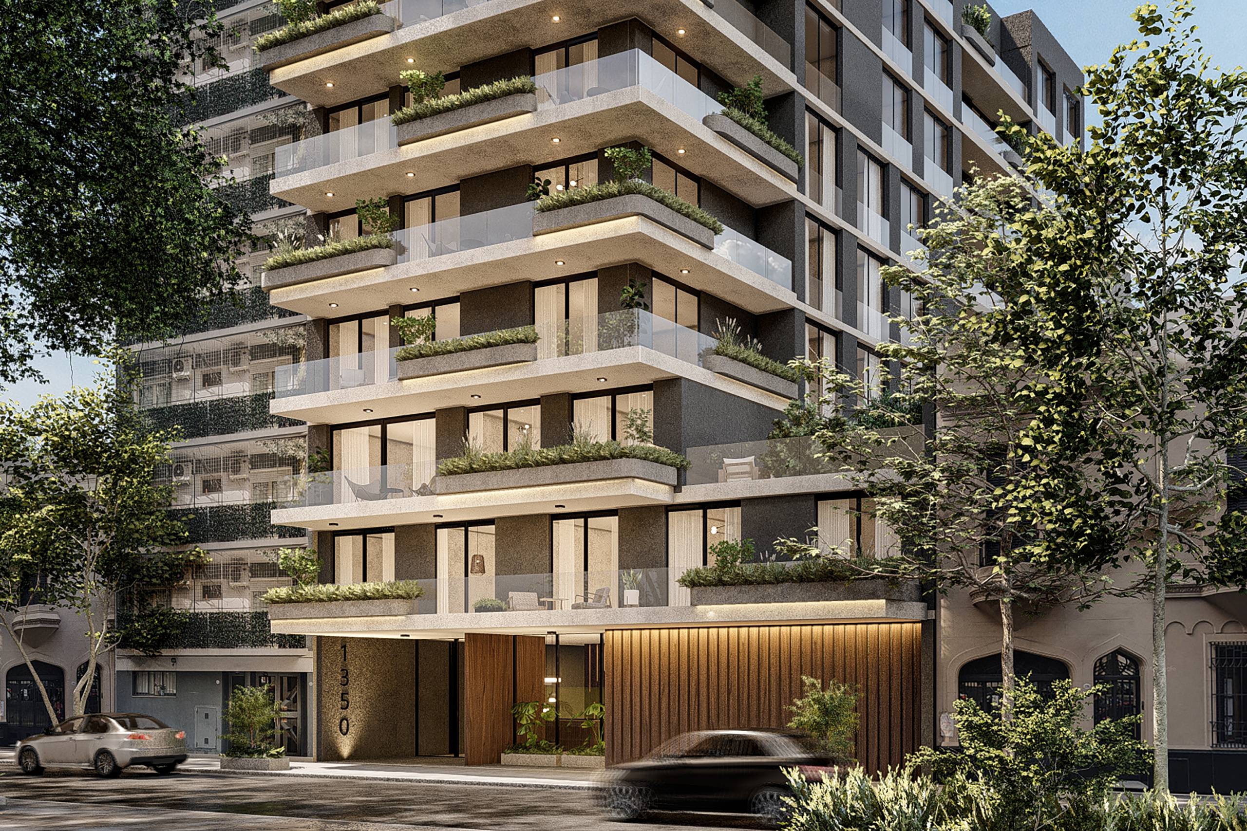 Sobre Alberdi se eleva una torre de 10 niveles con terraza, pileta y solárium, mientras que el frente de Falcón presenta un cuerpo de 8 pisos con amplios balcones y vegetación integrada. La continuidad de planos y canteros otorga movimiento y textura a las fachadas, generando una imagen cálida, contemporánea y coherente en sus dos caras.