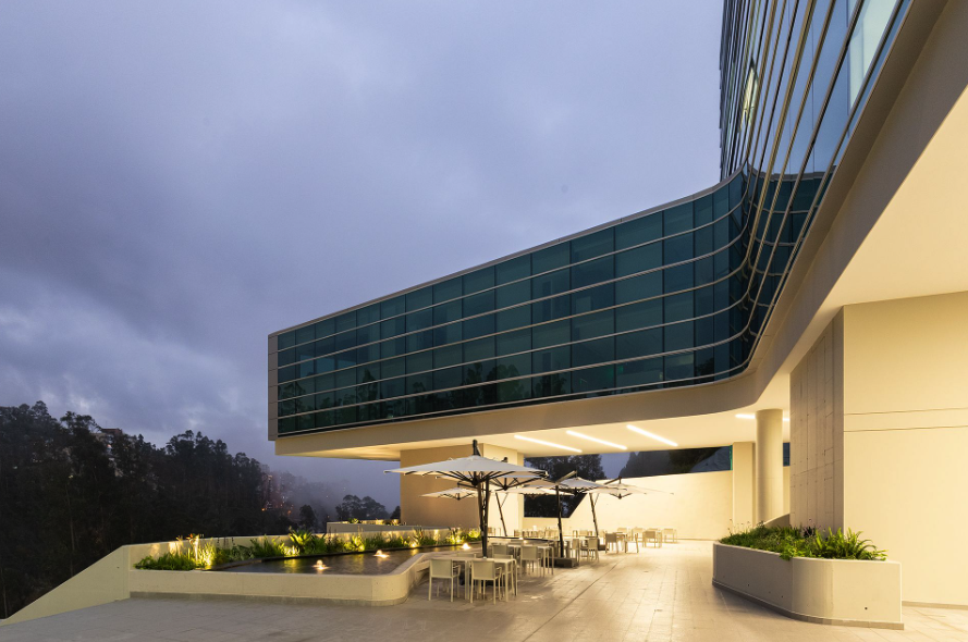 El partido arquitectónico que propusimos se basa en un esquema de dos tiras paralelas que se abren al exterior para incluir el paisaje como actor fundamental del espacio. Un gran atrio central –al cual se accede por una explanada que se adapta topográficamente al terreno natural– conecta los dos prismas vidriados que, en algunos niveles, se unen por medio de puentes. Un voladizo se desprende del volumen principal para captar las mejores vistas hacia el valle generando un movimiento gestual y lúdico del conjunto hacia la Vía Nayón.